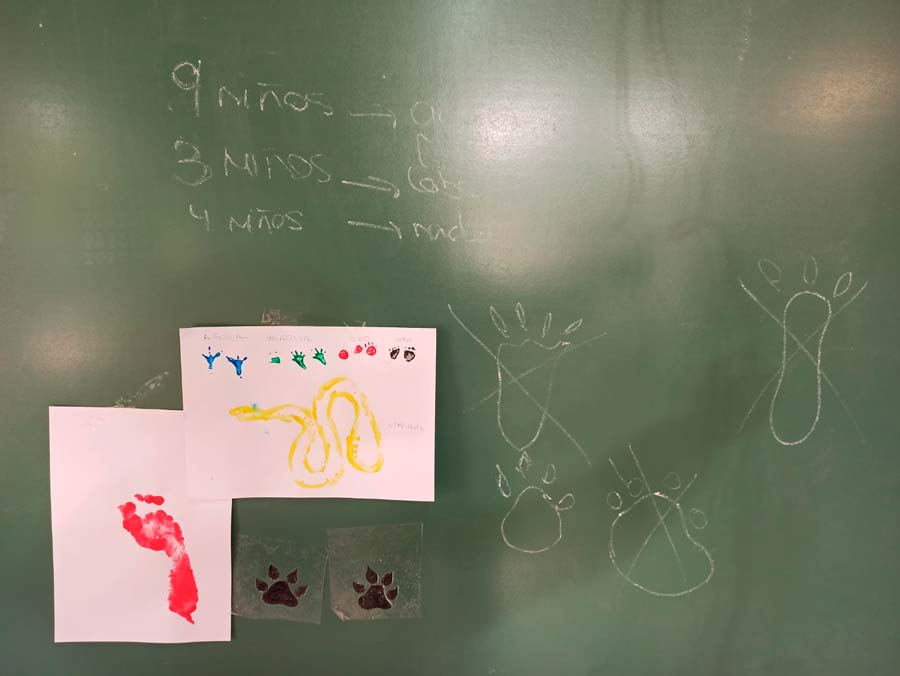 Con todos los animales en mano, hemos propuesto estampar sus huellas en un folio para ver si alguna se parece algo a las que tenemos repartidas en clase.